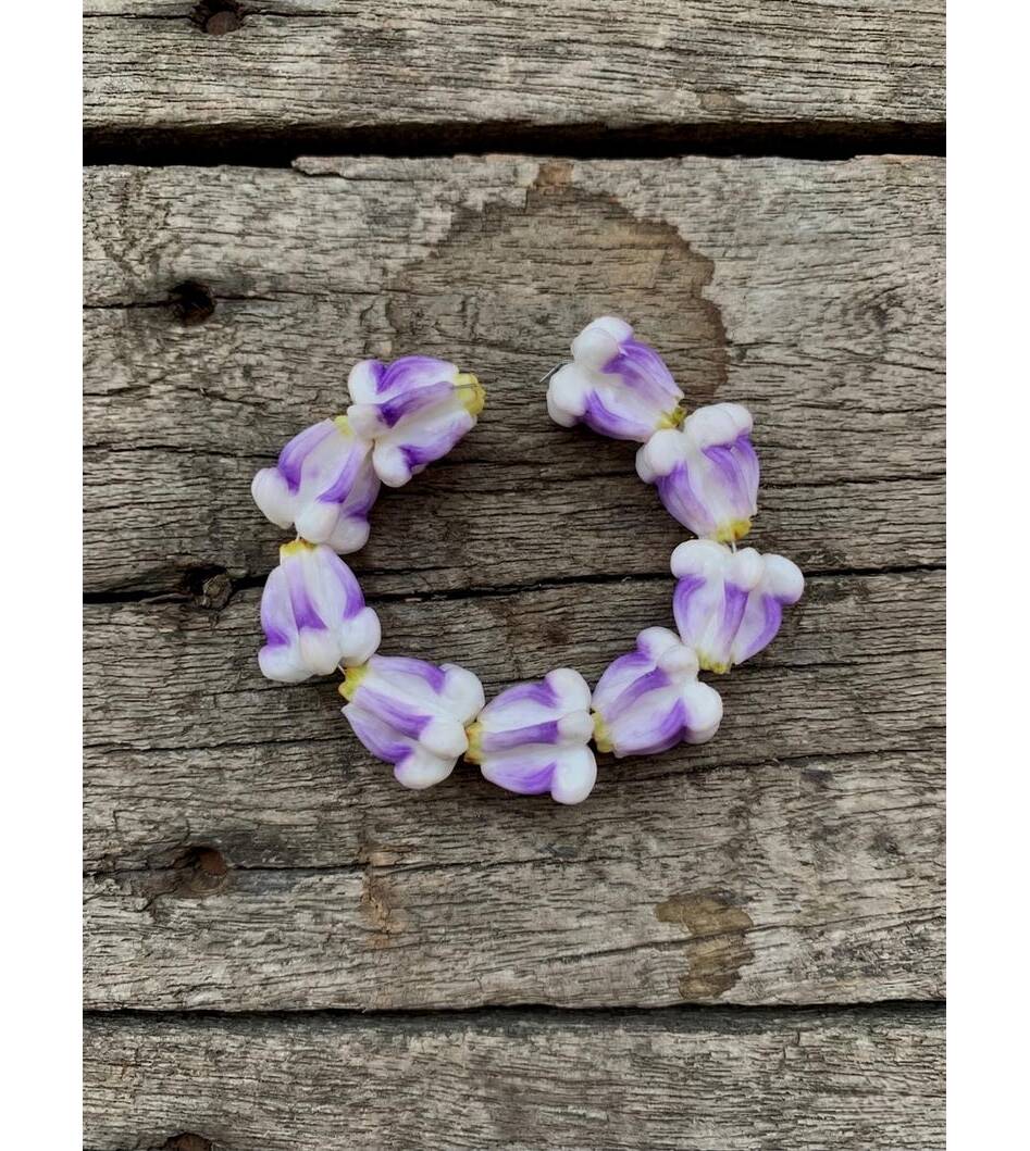 “Available in 1.5–1.6 cm. Each crown flower is carefully hand-painted with purple.”