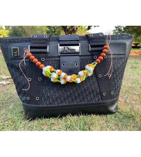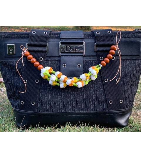 Hawaiian-style lei made from pakalana -inspired flowers. This piece is a combination of three leis brought together as one complete - Orange Pakalana flowers with pikake buds - Yellow Pakalana flowers with pikake buds - lemon green Pakalana flowers with pikake buds