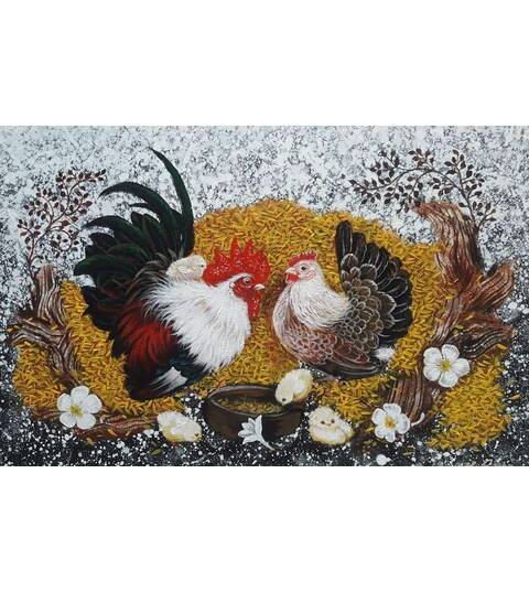 An acrylic painting of a chicken couple with little chicks written on canvas, it belongs to the brush of a remarkable Thai artist Krisanachai Sripila.