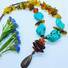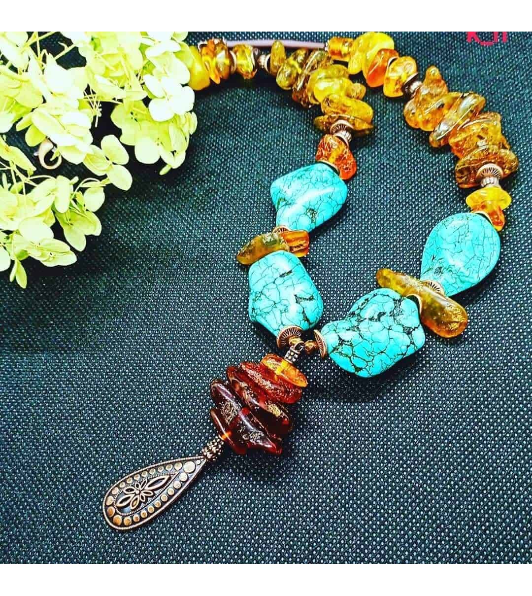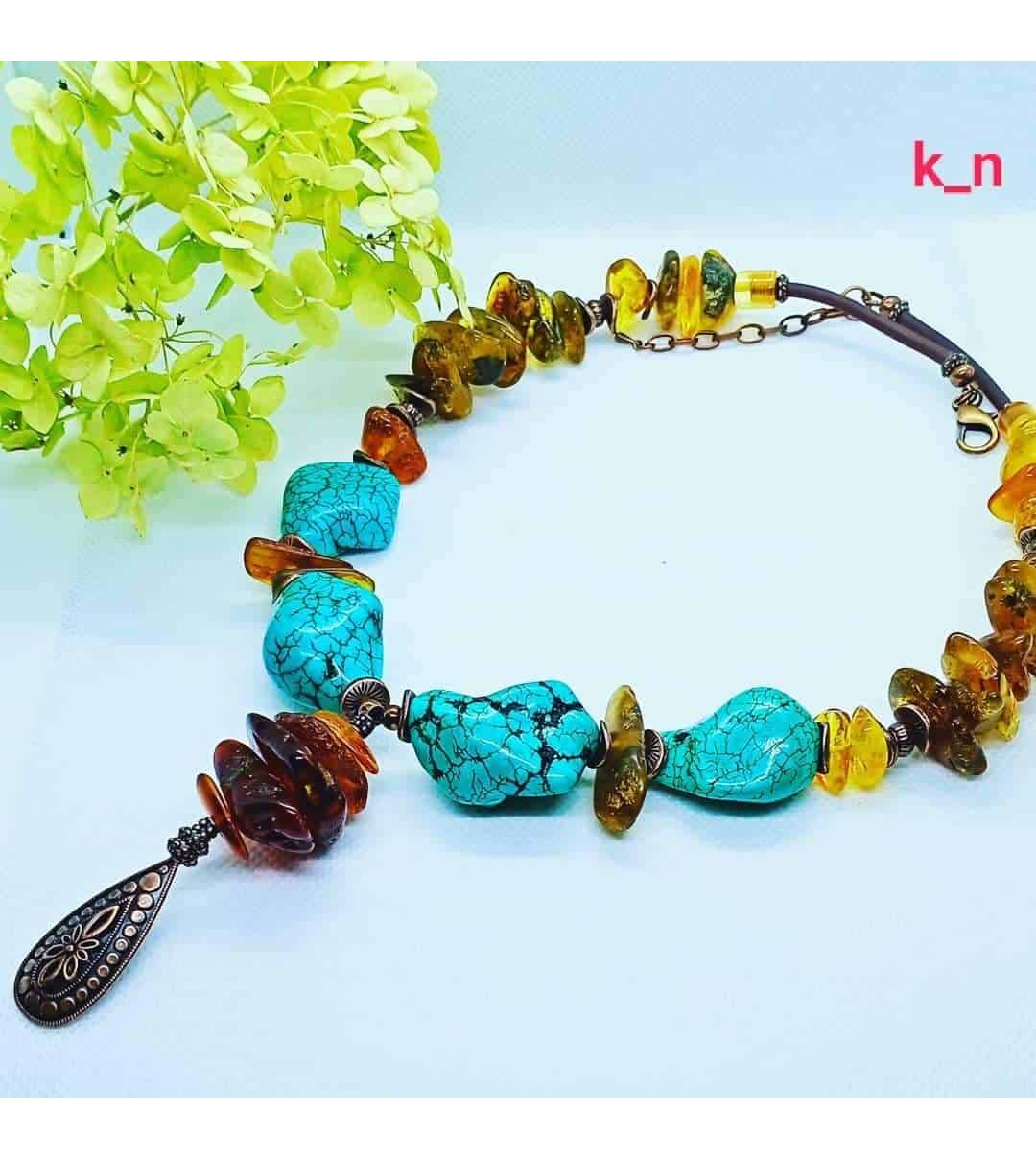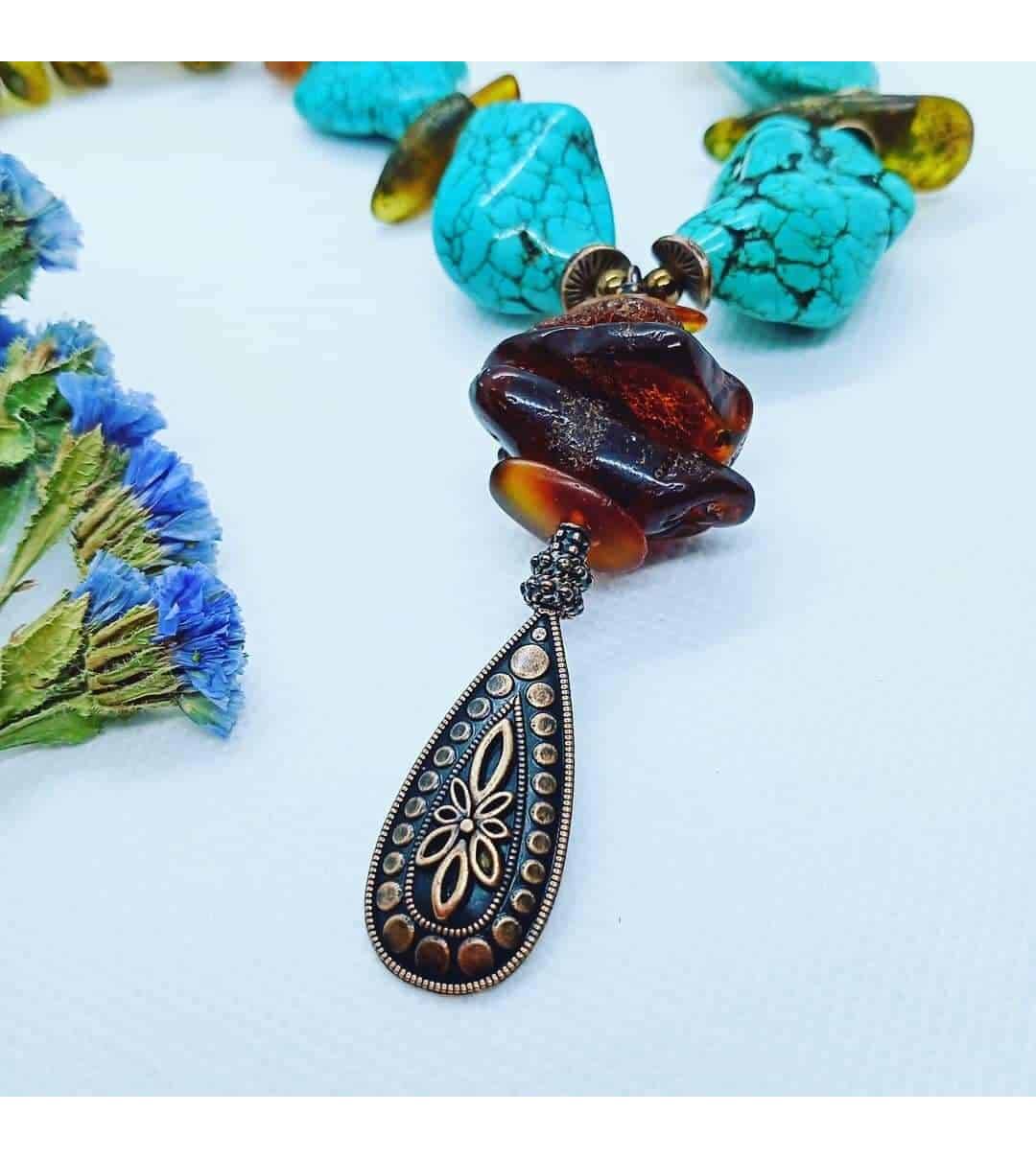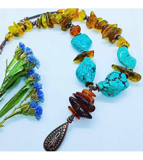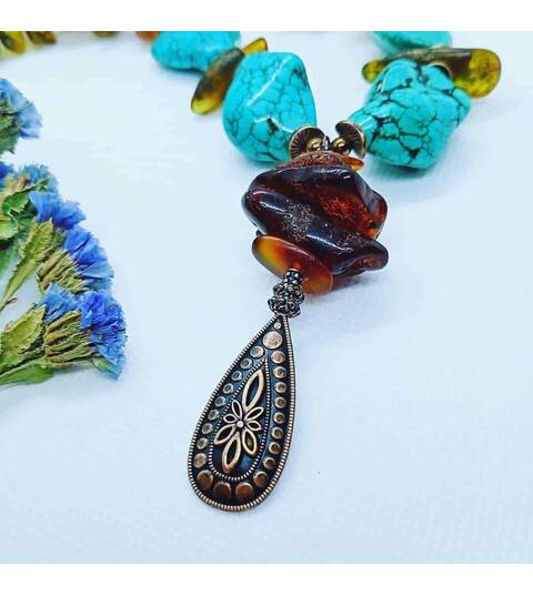 Ambre naturel et turquoise (imit.) avec des apprêts cuivrés.