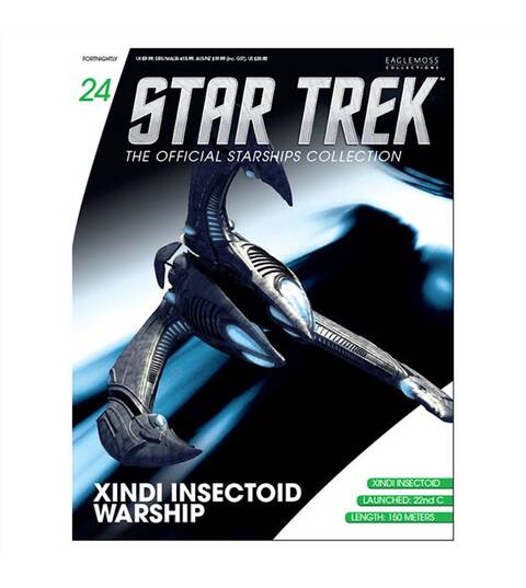 เล่มที่ 24 คือ Xindi Insectoid Warship ซึ่งเป็นรูปแบบสามขาที่แปลกประหลาดซึ่งเปิดตัวใน Star Trek: Enterprise ฤดูกาลที่สาม มันเป็นหนึ่งในเรือที่อันตรายที่สุดที่ลูกเรือพบใช้กระแสน้ำวนในการเดินทางด้วยวาร์ปความเร็วสูงและไม่มีอะไรที่เราจะจำได้ว่าเป็นสะพาน เรือได้รับการออกแบบโดย John Eaves ผู้ซึ่งแบ่งปันภาพวาดแนวคิดดั้งเดิมของเขาและเผยให้เห็นว่าเขาได้รับแรงบันดาลใจจากก้ามปูปู
