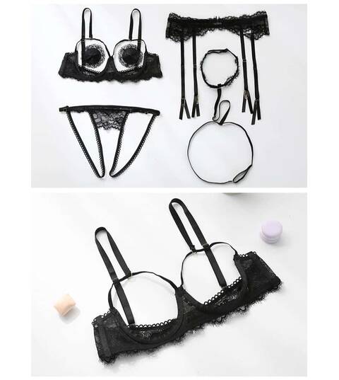 Sexy Lingerie 4PCS Halter Bra Crothcless Panty Garter Belt Lingerie Set Women's Sexy See Through Open Crotch G-string, Black Lingerie Sets