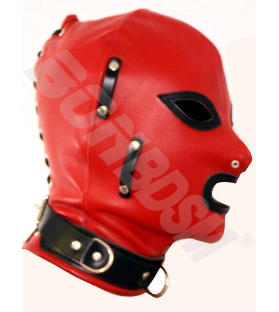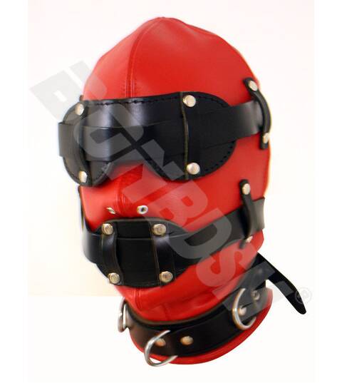 Blindfold Bondage Fetish Mask Red and Black Leather Gimp Hood With Silicone Gag, Mature