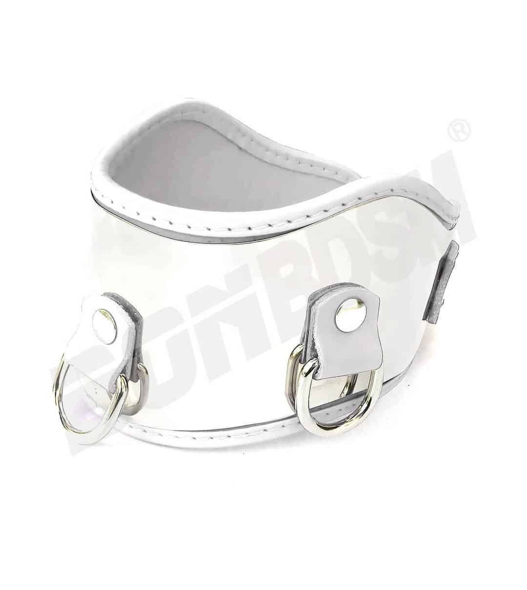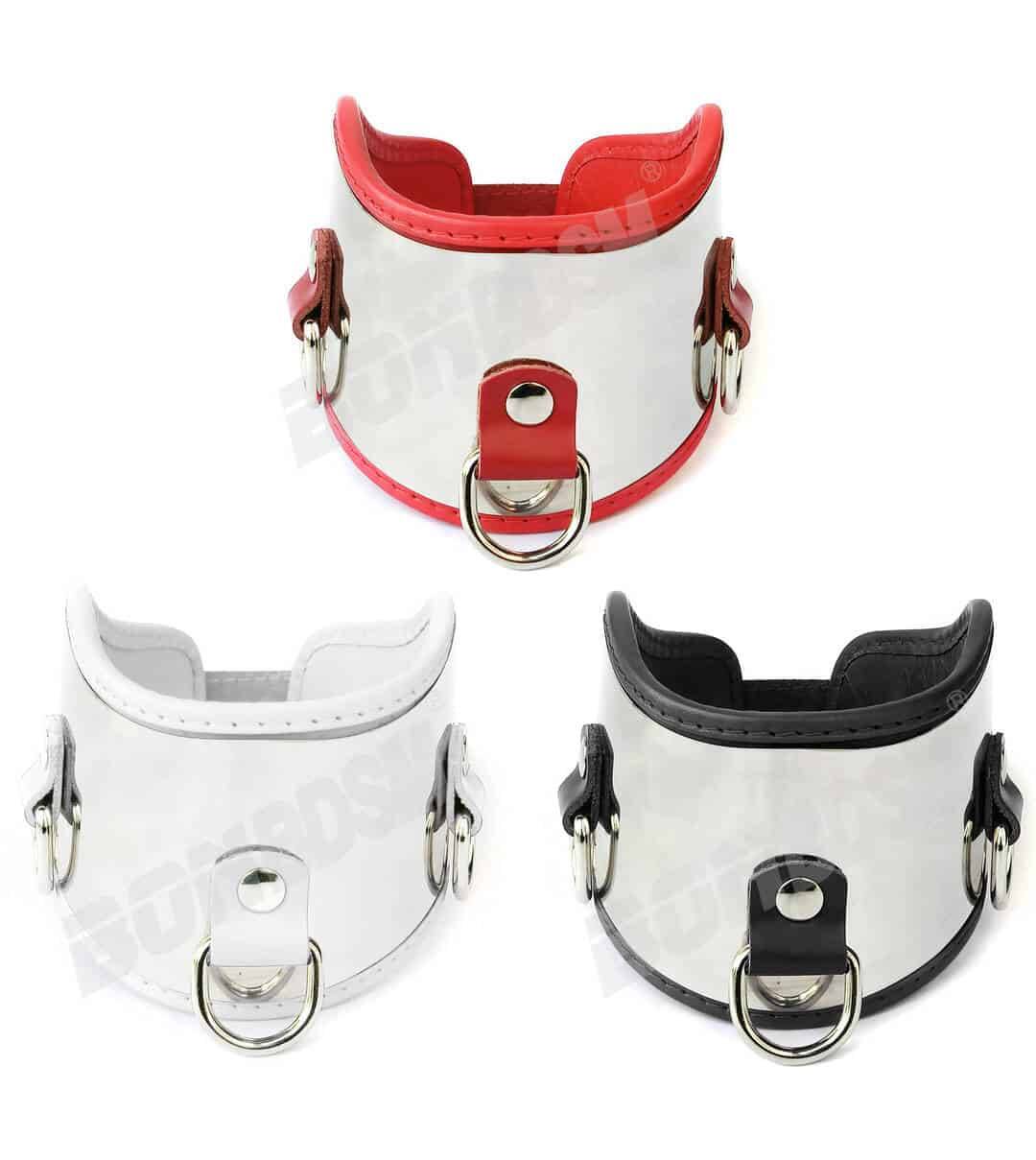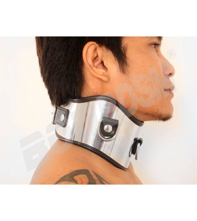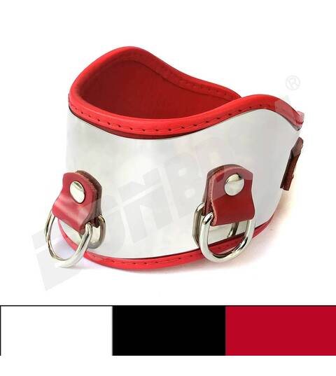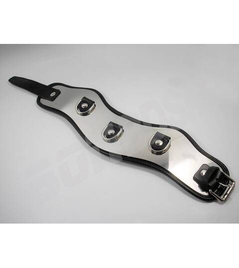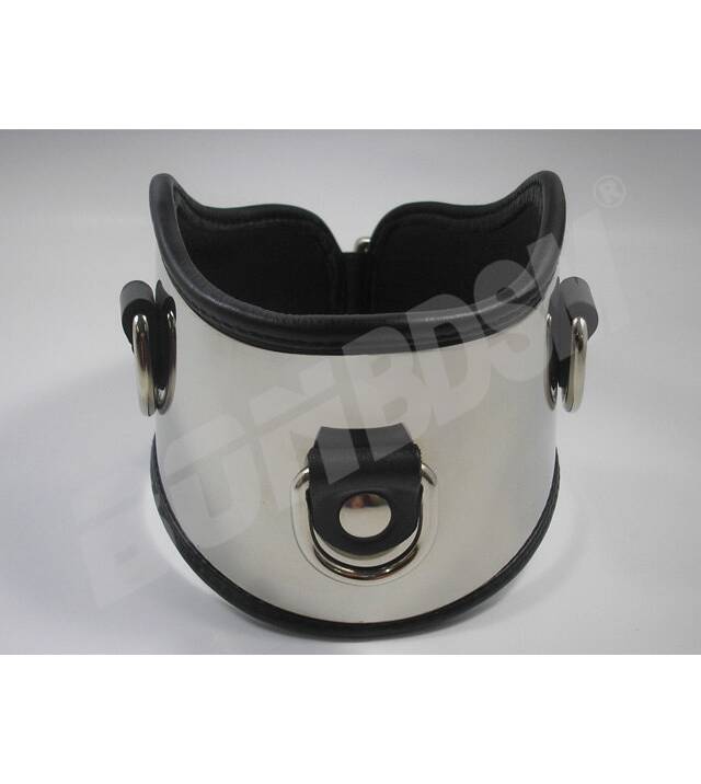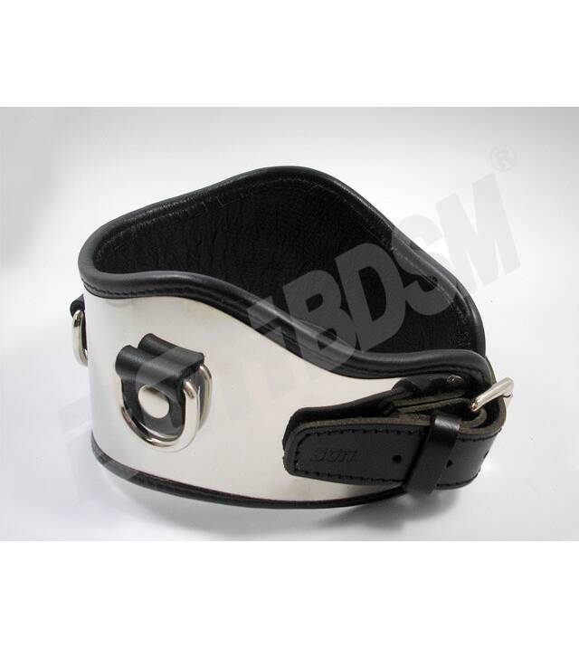 Using the roller buckle it easy to adjust the collar around the neck. There are three D-rings to attach a collar or other bondage equipment.
