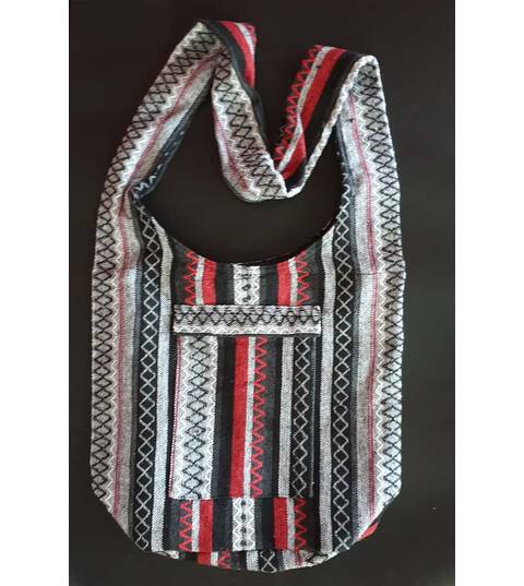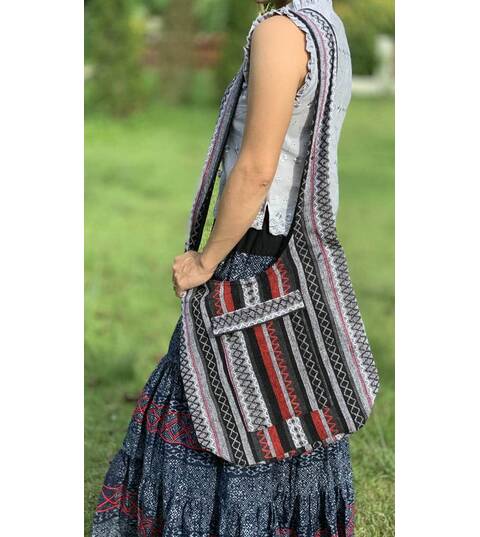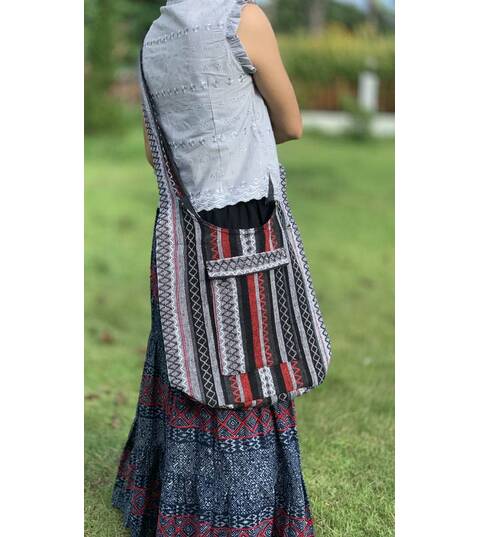 กระเป๋าทรงเสน่ห์ที่ทำจากผ้าไทยธรรมชาติแข็งแรงและกว้างขวางมีพื้นที่เหลือเฟือสำหรับสิ่งของในชีวิตประจำวันหรือการจับจ่ายของคุณ มีกระเป๋าด้านหน้าเพิ่มเติมเพื่อความสะดวกและตกแต่งด้วยงานปักด้วยมือที่มีความชำนาญของเครื่องประดับแบบดั้งเดิมสีดำ - แดง - ขาว