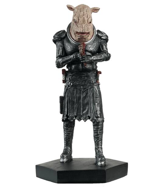 La figurine en résine métallique très détaillée a été méticuleusement peinte à la main et représente le capitaine dans l'armure de corps noire portée par tous les Judoon, y compris leur bioscanner et leur étui, alors qu'il tient un blaster. Le capitaine Judoon a également enlevé son casque pour révéler les traits du visage de Rhino.