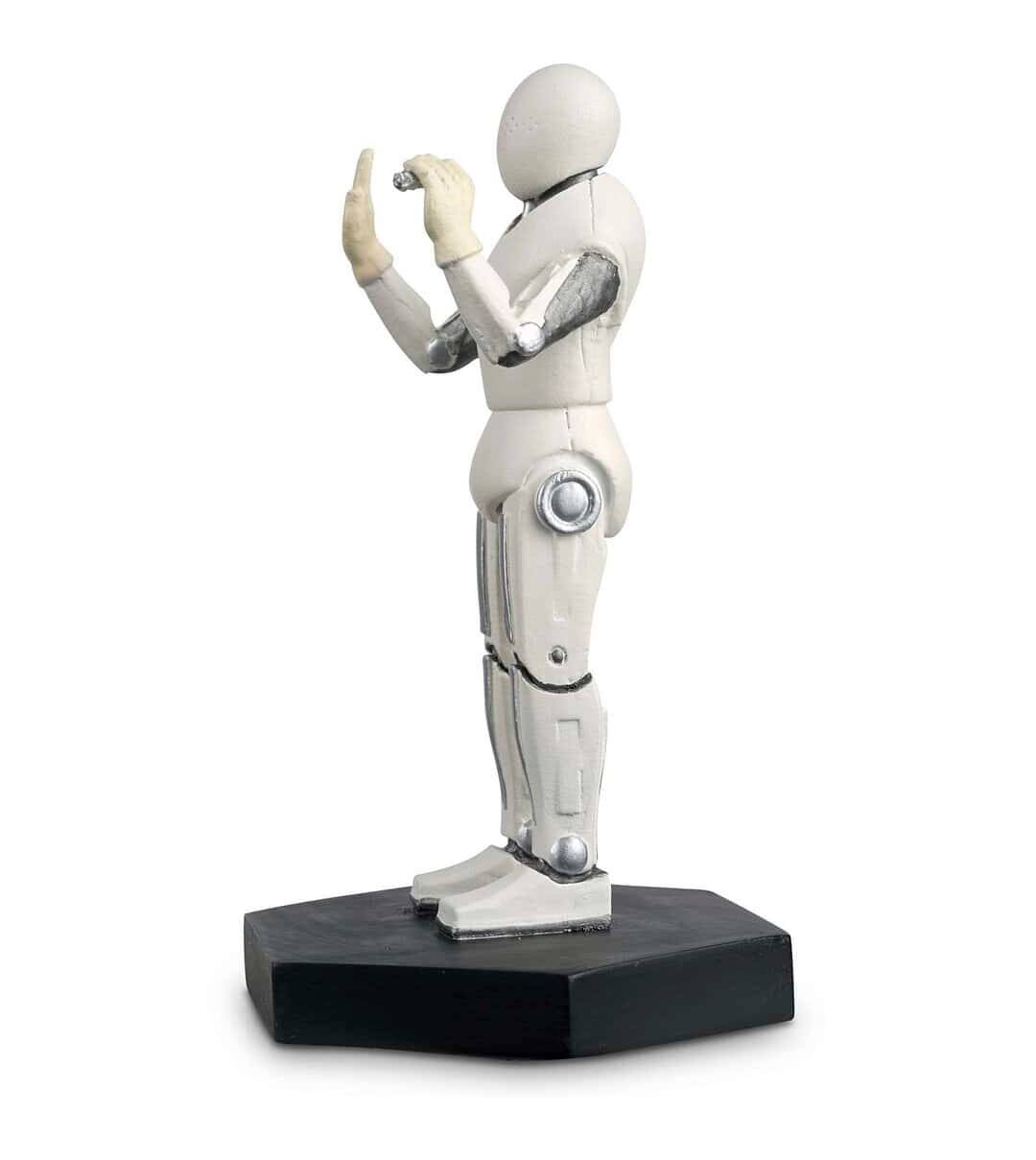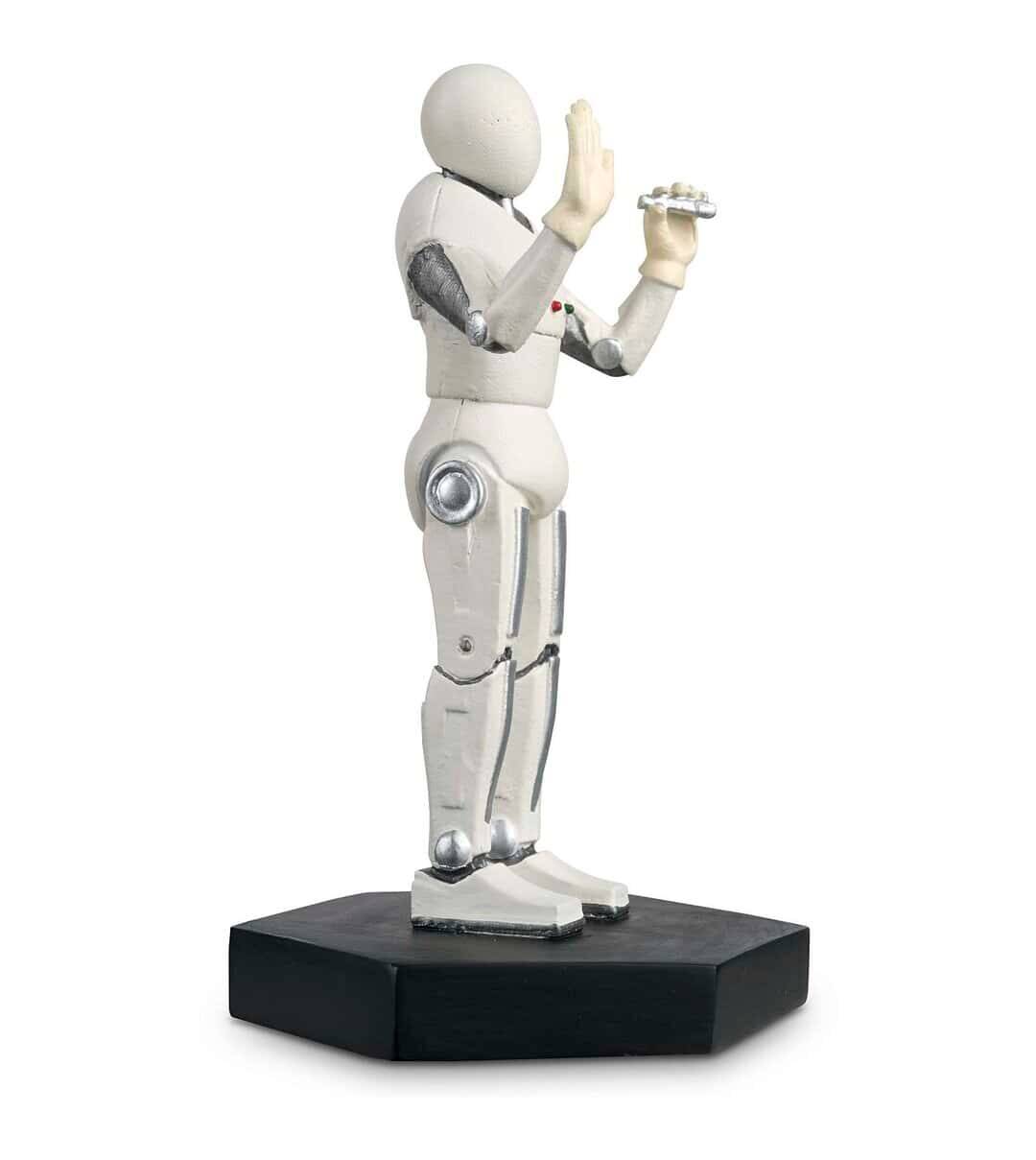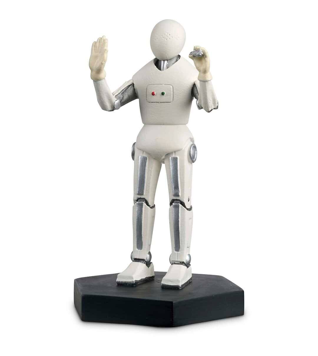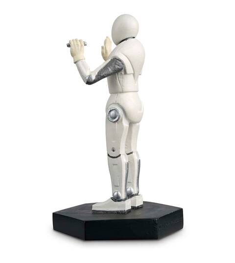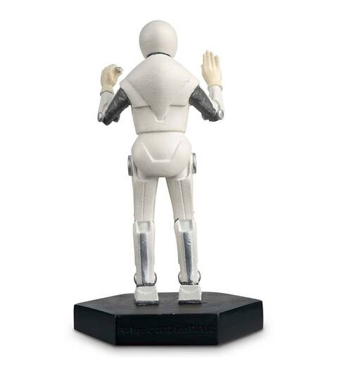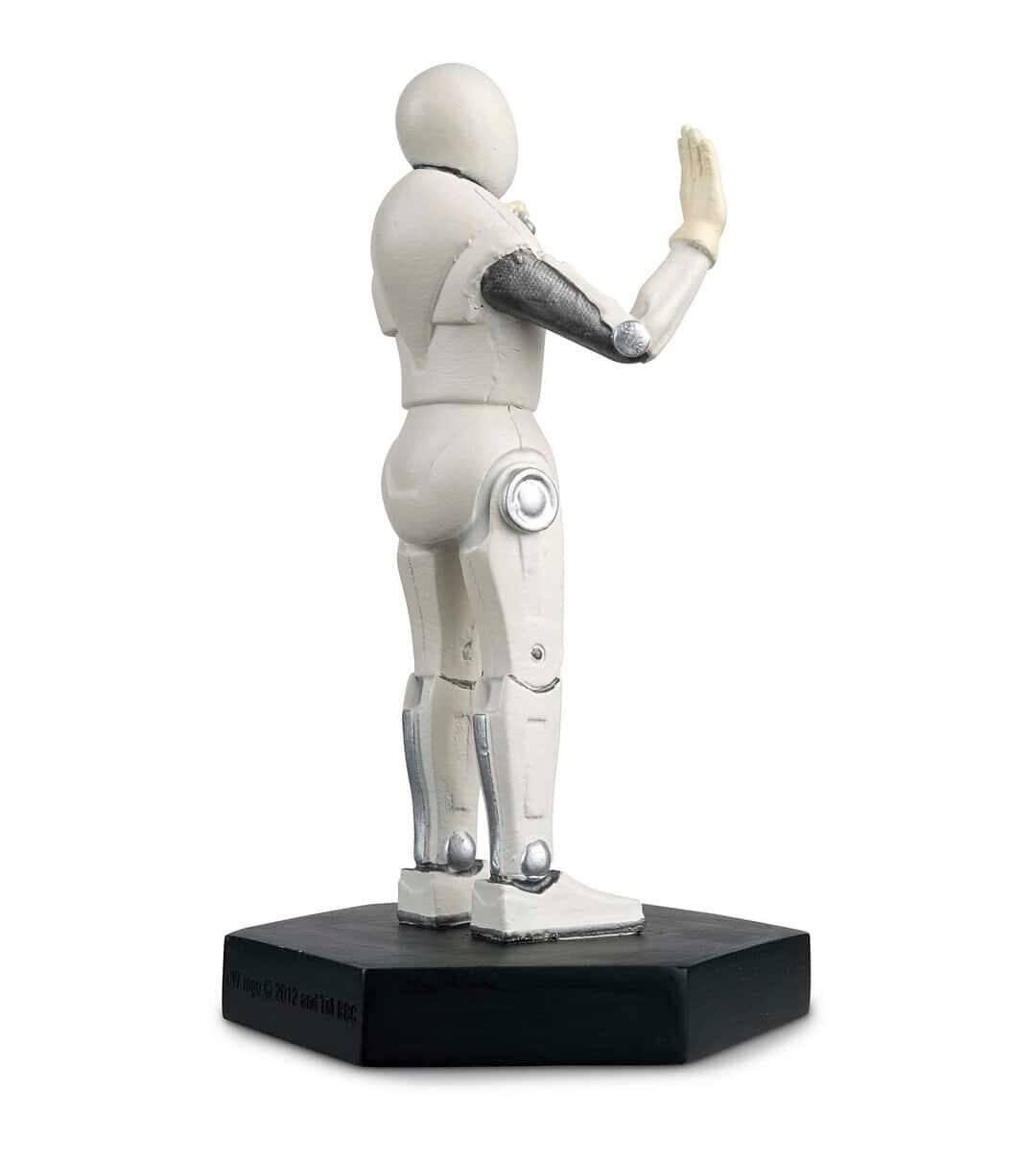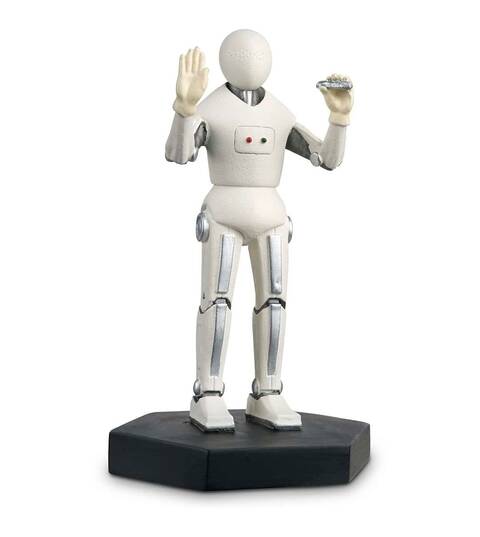 Cette figurine en résine métallique brillante représente l'un des handbots tels qu'ils apparaissent dans l'épisode de 2011 "La fille qui attendait". Ces robots sont des assistants médicaux sympathiques et aimablement mécaniques qui souhaitent limiter toute contagion possible pour les patients de l'installation Two Streams sur la planète Apalapucia. La figurine Handbot présente son corps mécanique blanc, avec des joints au fini chromé et un boîtier d'alimentation dans la poitrine.