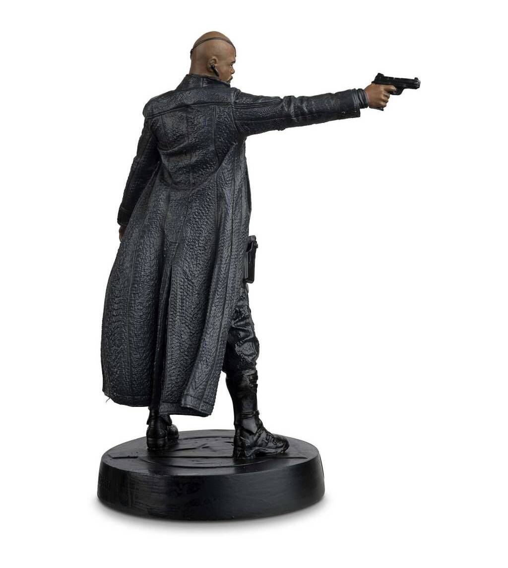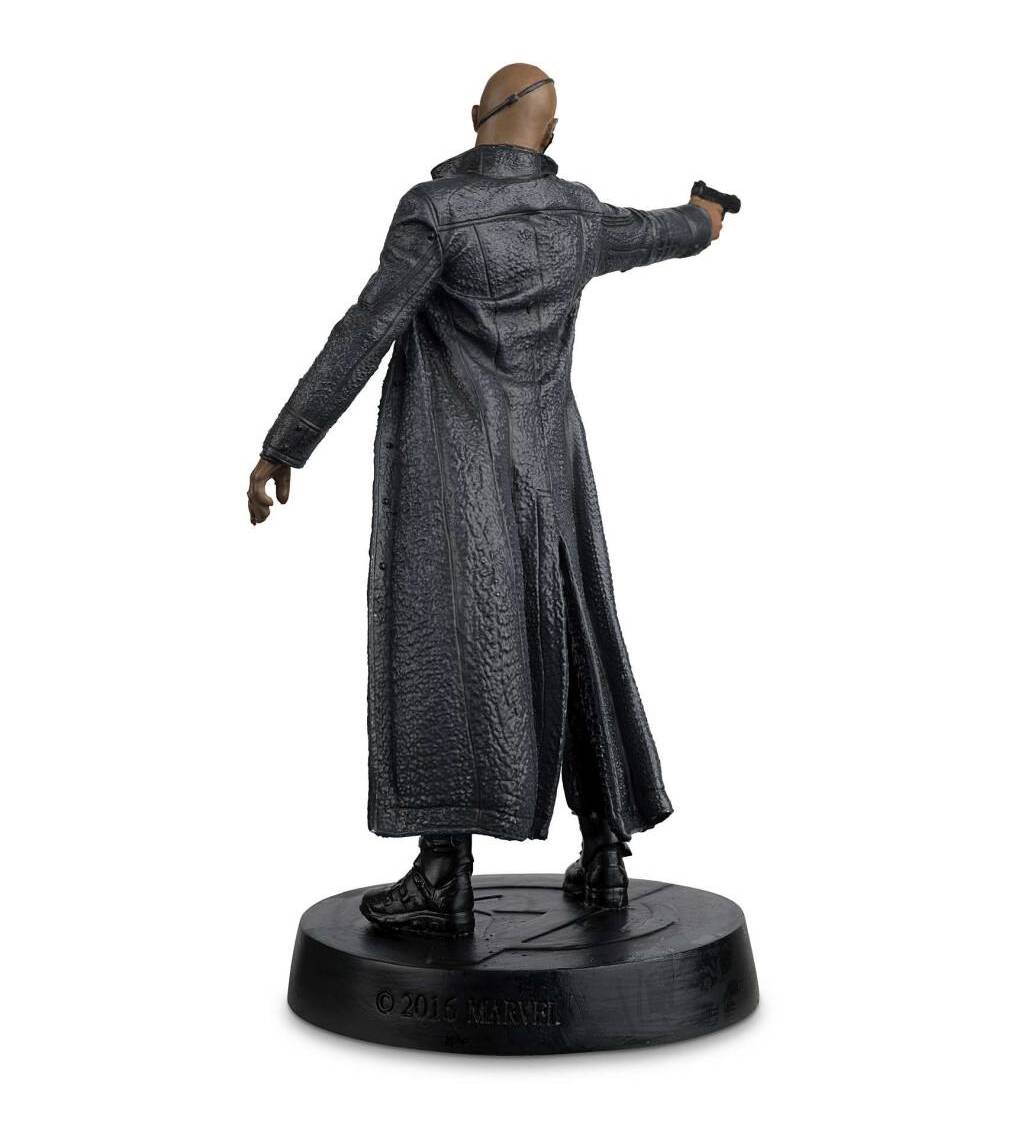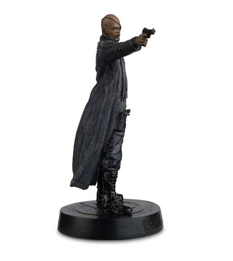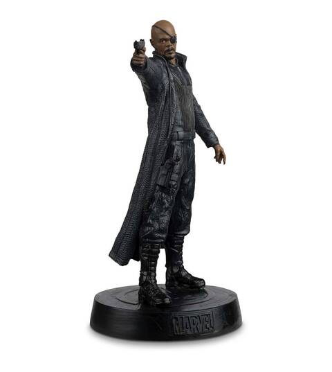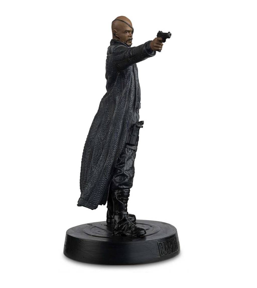 This Marvel Nick Fury figurine captures the likeness of Samuel L. Jackson as Nick Fury in The Avengers Movie. Your Fury figurine is brought to life in metallic resin and depicts Nick’s trademark black eyepatch, finely tailored black leather trench coat and detailed tactical boots. Posing with Smith & Wesson gun ready to kill, making him a fantastic addition to any Marvel collection.