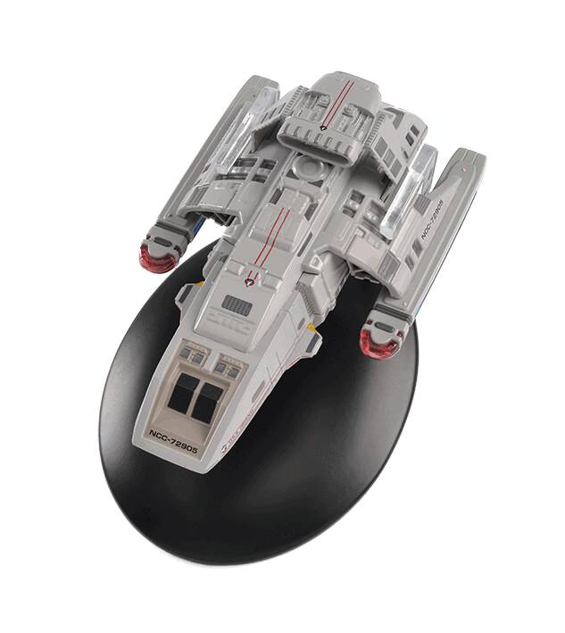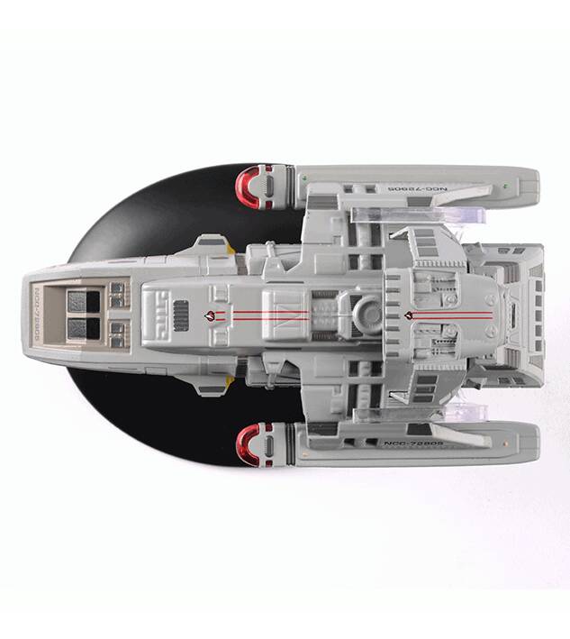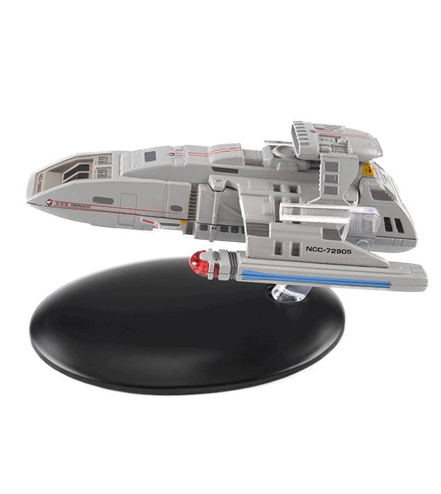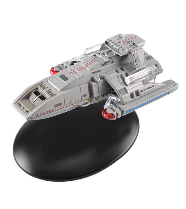 The Danube-class Starfleet Runabouts were a workhorse for the crew aboard Deep Space 9, and were ideal for a variety of different mission types, ranging from simple personnel or cargo transport to scientific exploration and military reconnaissance operations. The ships in this class were named after famous rivers on Earth, including the Rio Grande, the Yangtzee, and the U.S.S. Orinoco. The runabout, however, was a little larger than a typical Starfleet ship-support shuttlecraft, and was designed for more extended missions and had a modular midsection and a small habitat section aft. The ship’s innovative and compact warp core was positioned horizontally and ran along the top of the craft, giving the runabout a respectable top speed of Warp 5. Defensive capabilities consisted of a duranium-composite hull with full shielding, six phaser strips, and a micro-torpedo launcher under the nose, making this tough little ship more than a match for often much larger vessels.