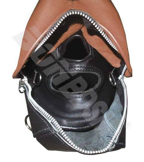 Unzip the muzzle for full access to the mouth. It has a removable mouth SILICONE gag that closed easily with Velcro belts, and can be removed or put on while the hood is being used. Our Leather mask fits easily with generous leather hair-guard and very thick laces. The hood has a leather collar with lockable buckle and 3 D-rings for attach a leash.