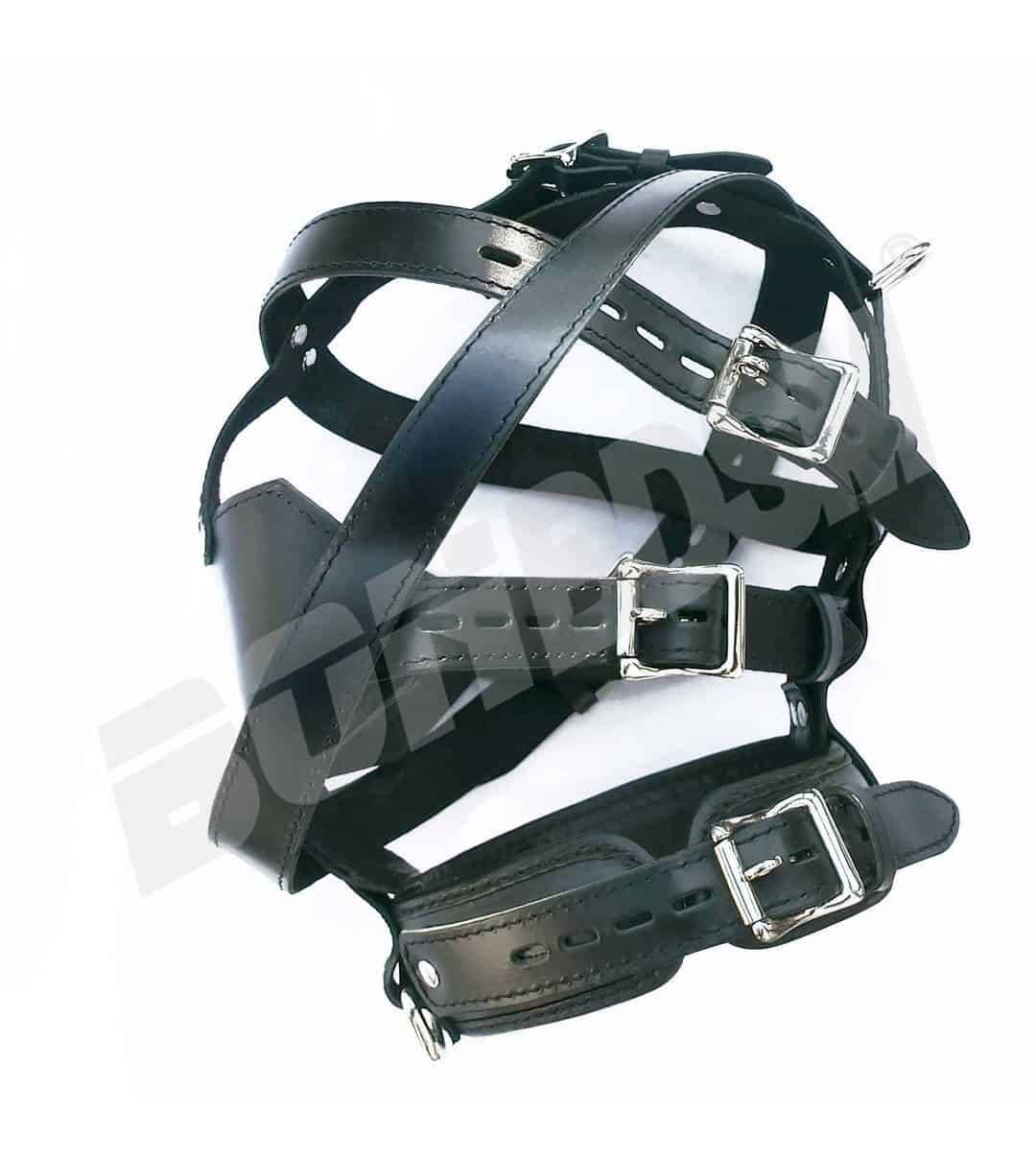 Fully adjustable to fit a wide range of head sizes and to make sure the muzzle remains centered. Features locking buckles, D rings and a soft padded leather lining.