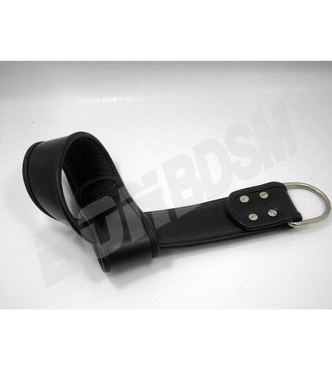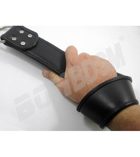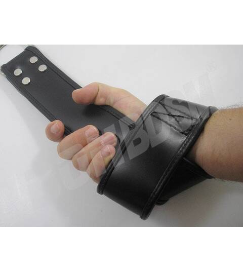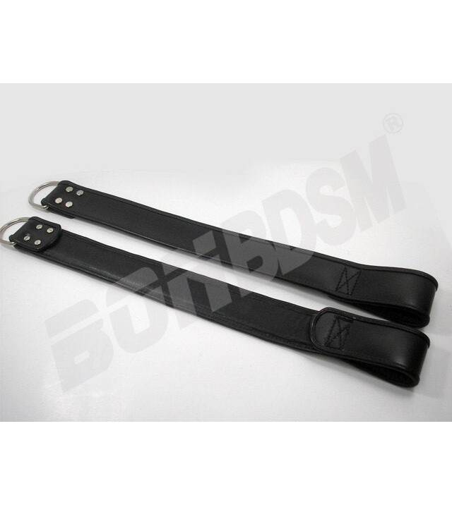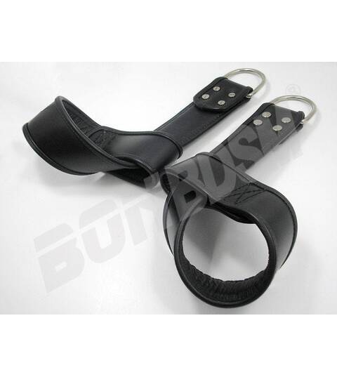 A beautiful pair of padded leather suspension wrist straps, made with 2 1/4" (57mm) wide and thick black leather with rolled edges. Has a soft padded leather lining keeps your wrists comfortable and protects your pressure points so you can struggle safely!