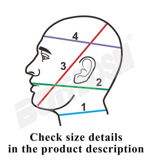 Size S-M - (neck) 1=30-41 cm/ 12-16' Inches, (mouth) 2=44.5-53 cm/ 17.5-21' inches, (chin)3=58-71 cm/ 23-28' inches, (forehead) 4=48-61 cm/ 19-24' inches.
