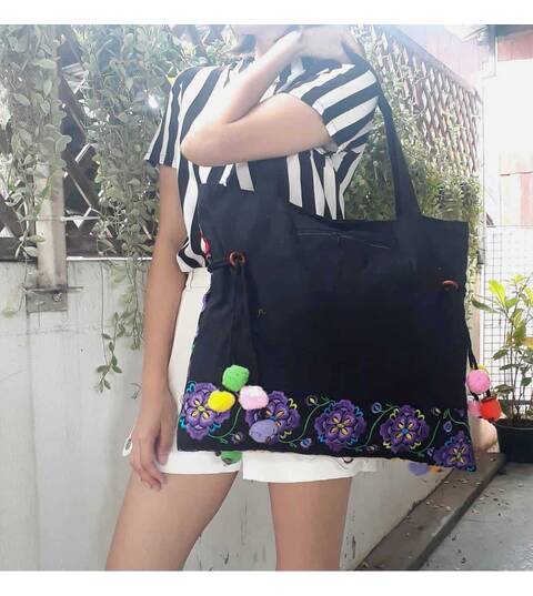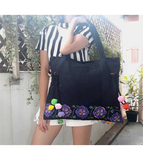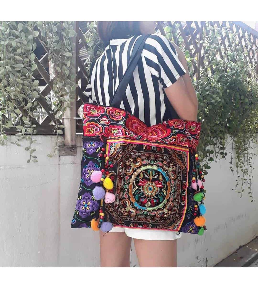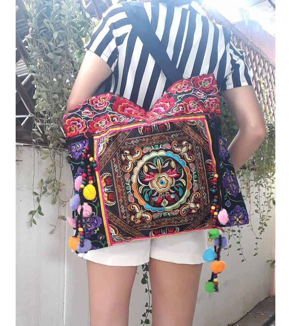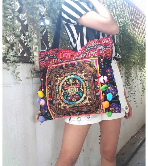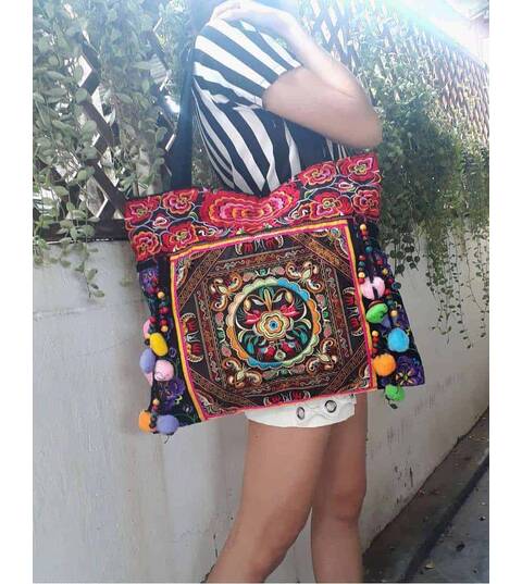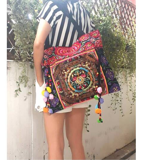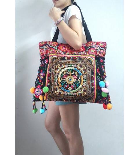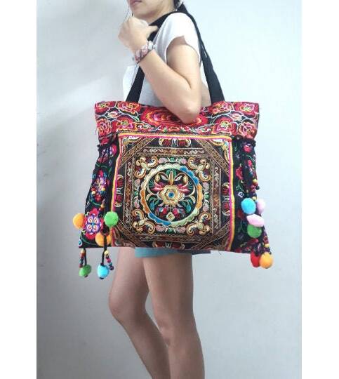 Ethnic Hobo Boho Asian Embroidered Thai Tote Shoulder Hmong Messenger HandBag pom pom